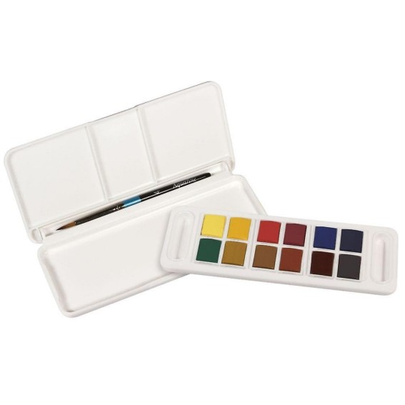 Taskukokoinen Aquafine Travel Set sisältää 12 puolikasta Aquafine-akvarellivärinappia sekä siveltimen. Rasiaa voi käyttää kätevästi maalauspalettina.