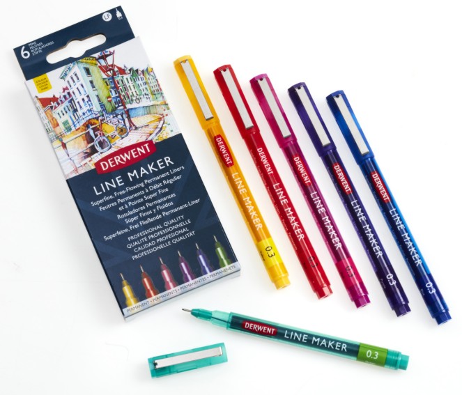 Derwent Line Maker markers for art and illustration. Line Maker and Paint Pem markers are solvent-free, water-based pigmented markers with a permanent and archivable pigment ink. Line Makers have a permanent, water-based and solvent-free pigment ink. Rich, clean, matte black pigment. High quality Japanese blades, light-resistant pigment ink Fast drying time and convenient fiber tip, resulting in soft, free-flowing lines. Assortment of six colors in a cardboard box.